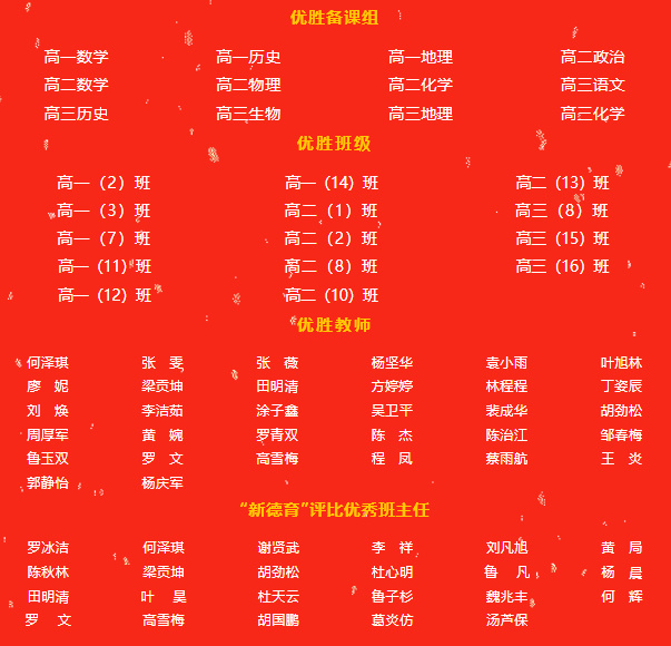 最后,对11月份在教育教学工作中表现突出的集体与个人予以表彰。其中,表彰高一、高二期中考试优胜备课组7个、优胜班级11个、优胜教师18名,高三11月月考优胜备课组5个、优胜班级3个、优胜教师14名,同步表彰11月“新德育”评比优秀班主任23名。表彰现场掌声雷动,充分激发了全体教职工争先创优的热情与动力。