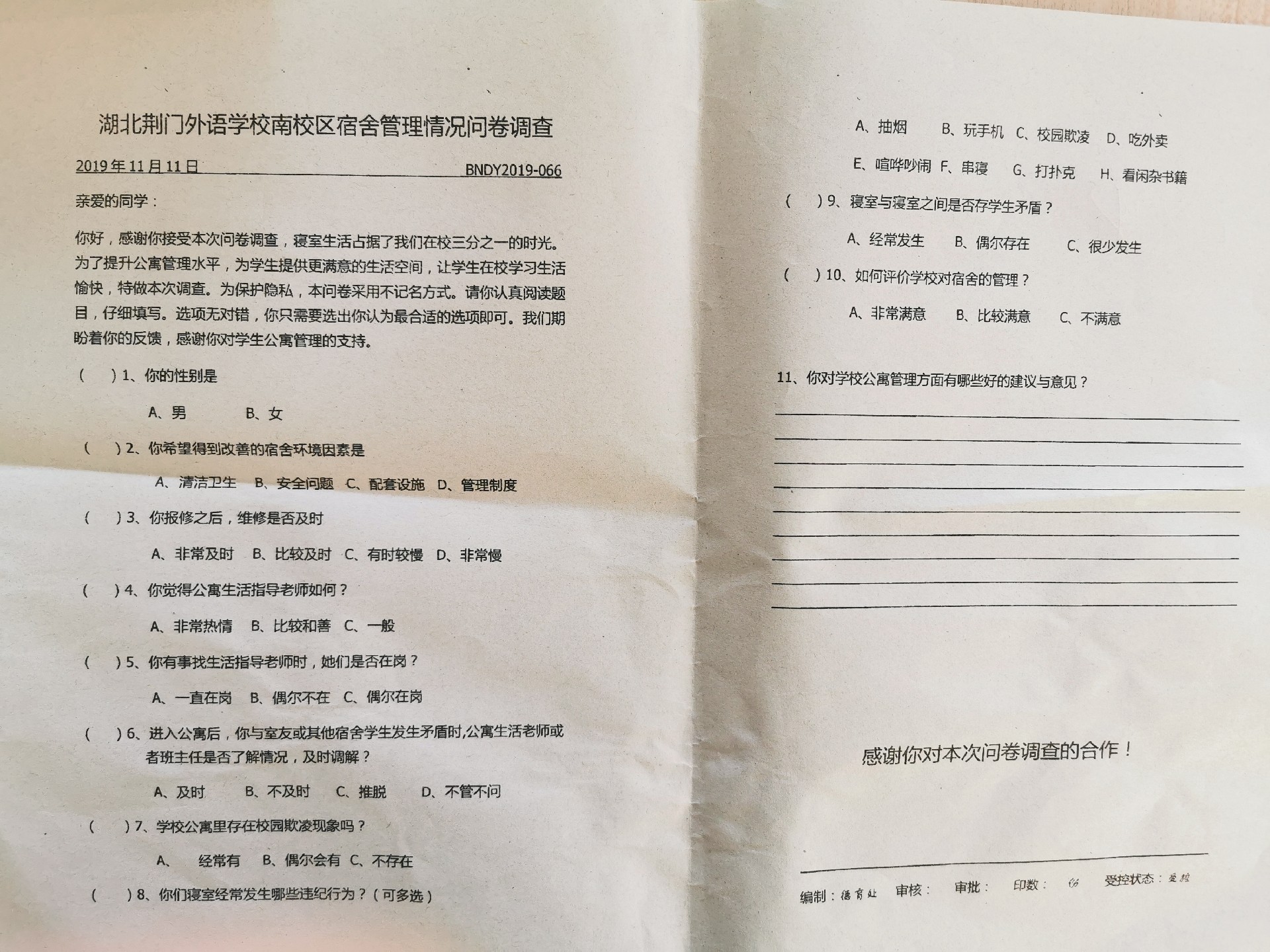 2019年11月14日中午,德育处在学校学术报告厅组织召开全体寝室长会议,开展寝室管理问卷调查,重点排查寝室欺凌现象,优化公寓管理,为学生提供更温馨更满意的生活空间。