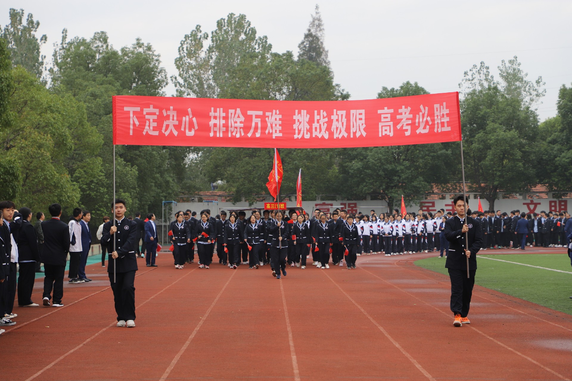 全校32个班级方阵以及国旗方阵、会徽方阵、彩旗方阵、篮球方阵、足球方阵等迈着整齐的步伐,昂首走过主席台,接受师生检阅。各方阵队列整齐,步伐坚定,士气高昂,各班富有个性特色的入场式表演,赢得了全场师生阵阵掌声。