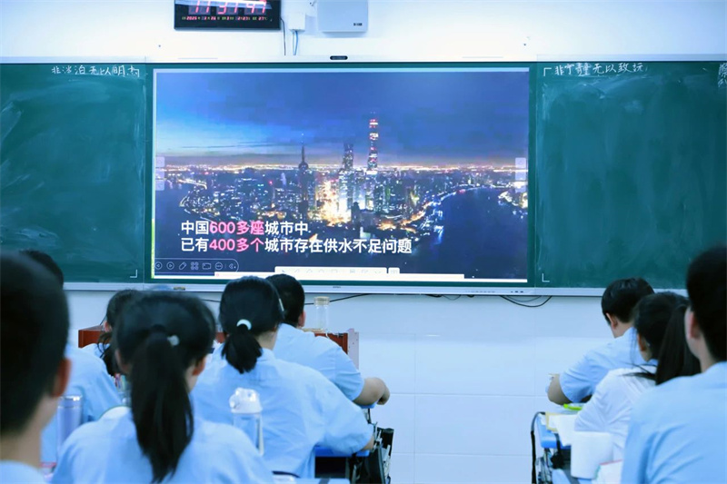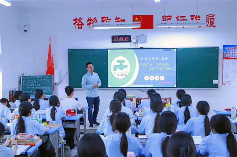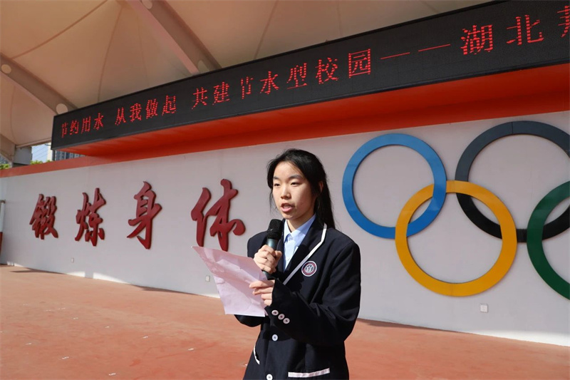 3月24日,全校师生齐聚操场参加节水主题升旗仪式。高二(14)班张露芳同学以《水润校园,共筑节水梦》为题发表演讲,用数据揭示水资源紧缺现状,呼吁师生从“关紧水龙头、一水多用”等小事践行节水承诺。