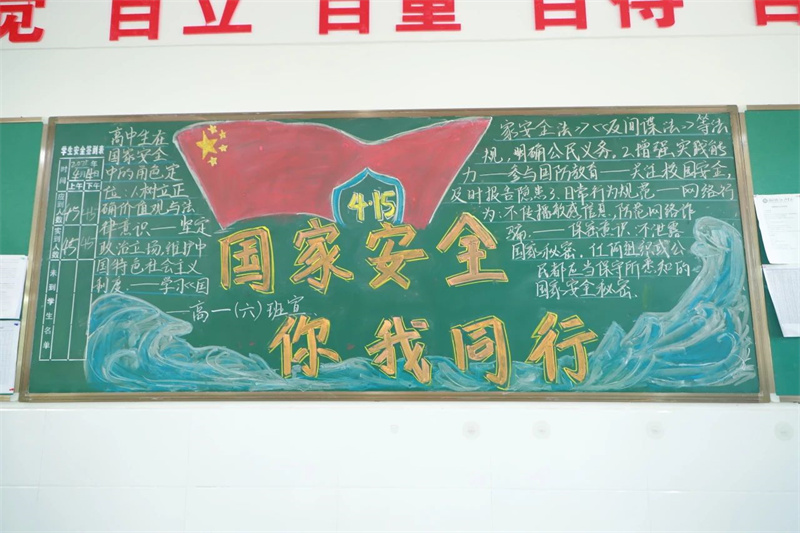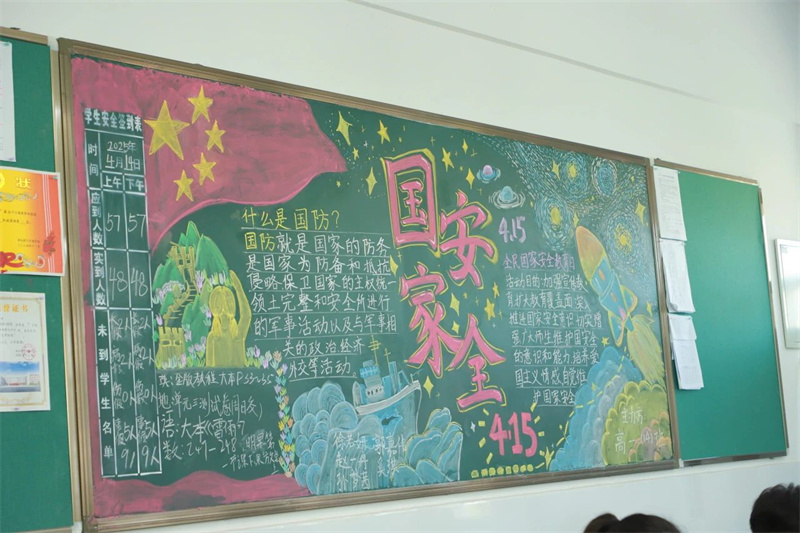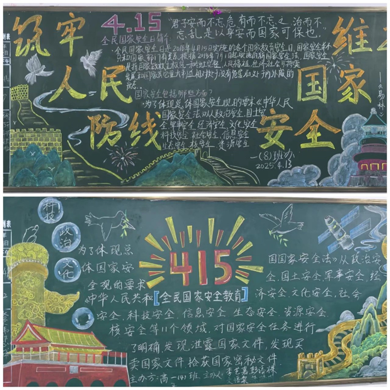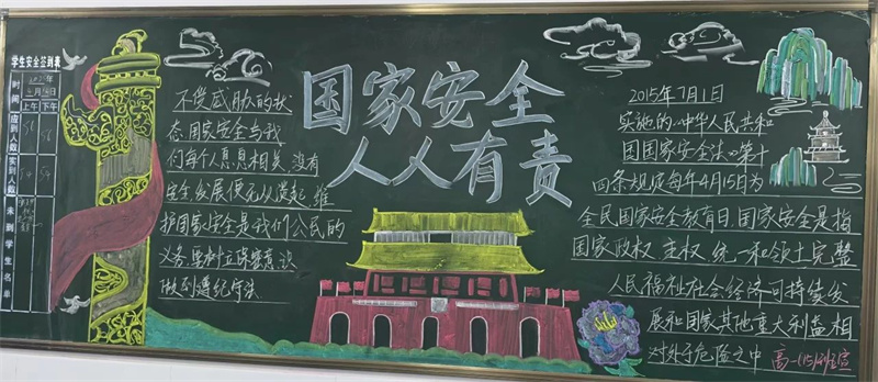 3、黑板报评比:为让同学们更深入地了解国家安全的内涵,学校举办了国家安全教育主题板报评比活动。各班纷纷响应,从构思布局到绘制上色,每一笔都凝聚着他们对国家安全的深刻理解。