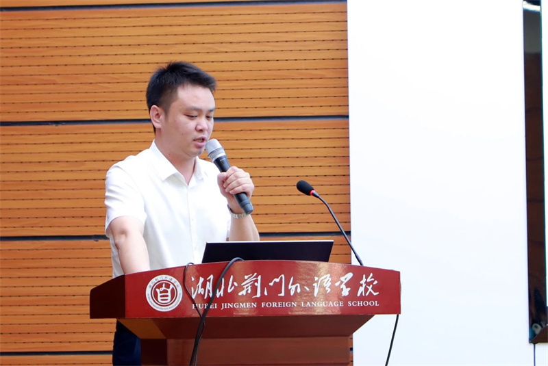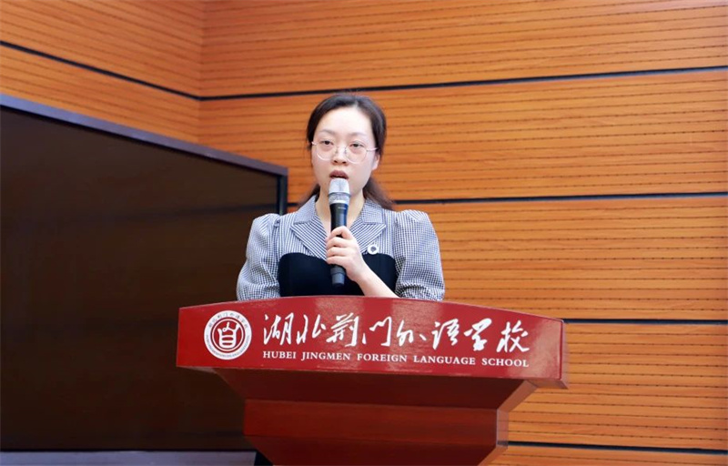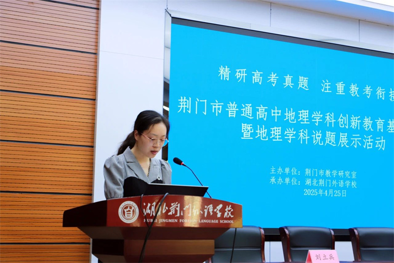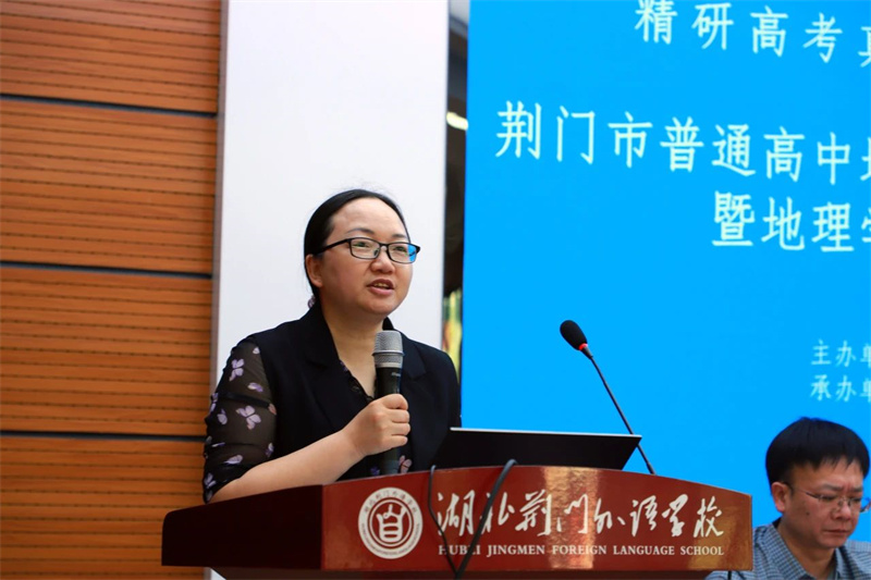 随后,荆门市教研室高中科科长陈艳科长为荆门市普通高中地理学科创新教育基地成立仪式暨地理学科说题展示活动开幕式致辞,对我校为此次活动做出的前期准备工作表示充分的认可。