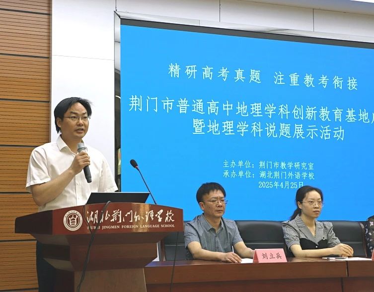 为了进一步推进荆门市普通高中地理教学教研高质量发展,发挥学校优势学科带动与辐射作用,搭建地理学科教研平台,提升教研品质,促进教师专业成长 ,由荆门市教研室主办、湖北荆门外语学校承办的“荆门市普通高中地理学科创新教育基地成立暨地理学科说题展示活动”于4月25日在我校隆重举行,本次活动以“精研高考真题,注重教研衔接”为主题,会议分为上午和下午两个部分。