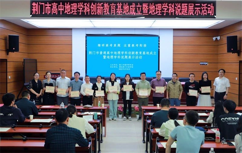 会议第三项,由荆门市教研室地理教研员、地理学科基地副组长梁爽老师宣读了荆门市普通高中地理学科创新教育基地中心组成员聘任名单,陈艳科长、朱小炳书记为中心组成员颁发聘书,全体组员进行了合影。